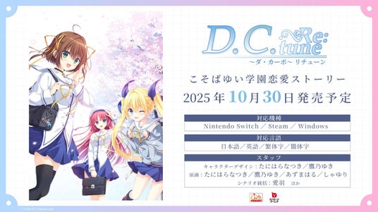 株式会社ブシロードは、2002年に発売された『D.C. ~ダ・カーポ~』のフルリメイク作品『D.C. Re:tune ~ダ・カーポ~ リチューン』の発売日を2025年10月30日(木)に決定し、Nintendo Switch、Steam、Windows向けに展開することを発表した。2025年5月28日(水)からパッケージ版の予約受付を開始する。『D.C.』シリーズはこれまでに75万本以上の売上を記録しており、アニメ化やコミックなど多様なメディア展開が行われているため、続報に対する期待が高まっている。