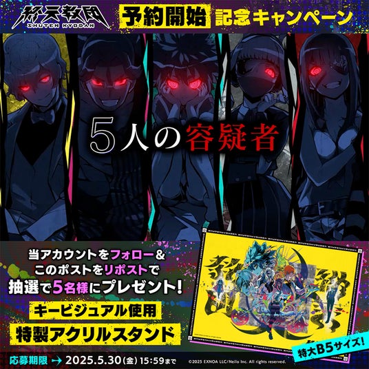 本作の予約開始を記念して、キービジュアルを使用したB5サイズアクリルスタンドが抽選で5名様に当たるキャンペーンを『終天教団』公式Xにて開催中です。
