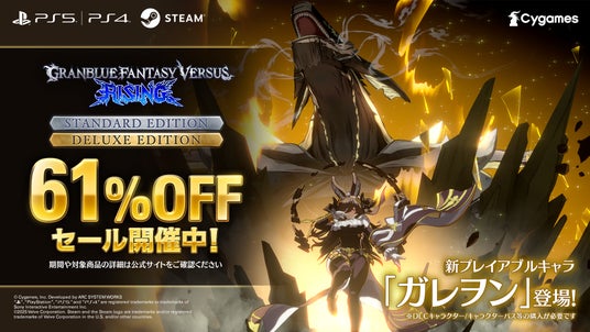 現在、『Granblue Fantasy Versus: Rising スタンダードエディション』および『Granblue Fantasy Versus: Rising デラックスエディション』を、61%OFFでご購入いただけるセールが開催中です。この機会にぜひお買い求めください。