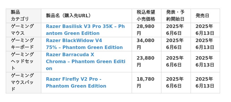 各製品はRazer Chroma™ RGBに対応し、1680万色以上の発光と連動する鮮やかなライティングを実現する。「Razer Basilisk V3 Pro 35K」は、精度・快適性・13個のプログラムボタンを備えた高性能マウス。「BlackWidow V4 75%」は、静音性と打鍵感を両立した次世代キーボード。「Barracuda X Chroma」は、高音質かつ快適な装着感を提供するゲーミングヘッドセット。「Firefly V2 Pro」は、透明なPCBとLEDライティングを特徴とするマウスパッドである。すべての製品がChroma対応ゲームと連携し、没入感のあるプレイ環境を構築する。