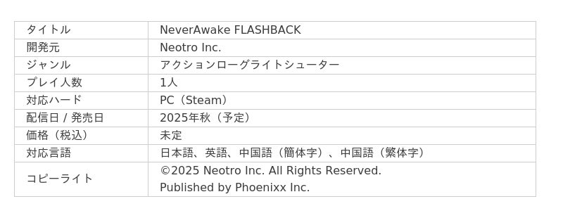 株式会社Phoenixx(フィーニックス)(東京都武蔵野市、代表取締役社長:坂本 和則)は、アクションローグライトシューター『NeverAwake FLASHBACK』をPC(Steam)向けに今秋配信決定したことをお知らせいたします。