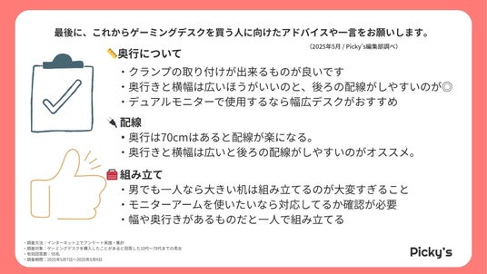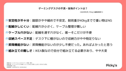 株式会社rentryが運営する商品レビューサイト「Picky's」は、ゲーミングデスクに関するインターネット調査を実施した。対象は、実際に使用した95名のユーザー。調査の結果、「天板の広さ」「昇降機能」「配線整理のしやすさ」などが、満足度の高いポイントとして挙げられた。一方で、「組み立ての難しさ」「収納の少なさ」「モニターアームの取り付けづらさ」といった不満も明らかになった。
