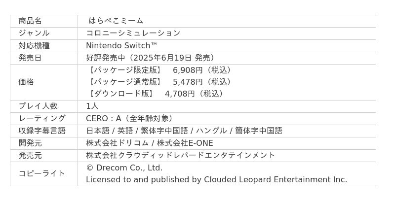 株式会社ドリコム(本社:東京都品川区、代表取締役社長:内藤裕紀、以下ドリコム)が原作/開発を担当する新作タイトル『はらぺこミーム』のNintendo Switch™版が、本日2025年6月19日(木)に世界同時発売されたことをお知らせします。本作のNintendo Switch™版のパブリッシングは、株式会社クラウディッドレパードエンタテインメント(本社:東京都品川区、代表取締役:陳 云云、以下CLE)が担当します。なお、ドリコムがパブリッシングを担当するSteam版は2025年7月31日に発売いたします。