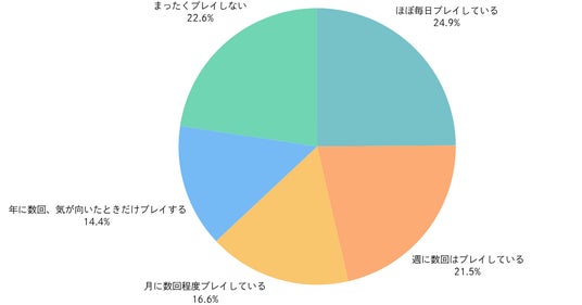 ほぼ毎日プレイしている:24.9%(717名) 週に数回はプレイしている:21.5%(620名) 月に数回程度プレイしている:16.6%(479名) 年に数回、気が向いたときだけプレイする:14.4%(414名) まったくプレイしない:22.6%(652名)