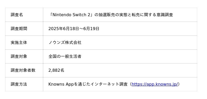 ノウンズ株式会社(本社:東京都渋谷区、代表取締役:田中啓志朗、以下「ノウンズ」)は、同社が提供するアンケートアプリ「Knowns App」(https://app.knowns.jp/)を通じて、全国の一般生活者2,882名を対象に「Nintendo Switch 2 の抽選販売と転売に関する意識調査」を実施しました(調査期間:2025年6月18日~6月19日)。