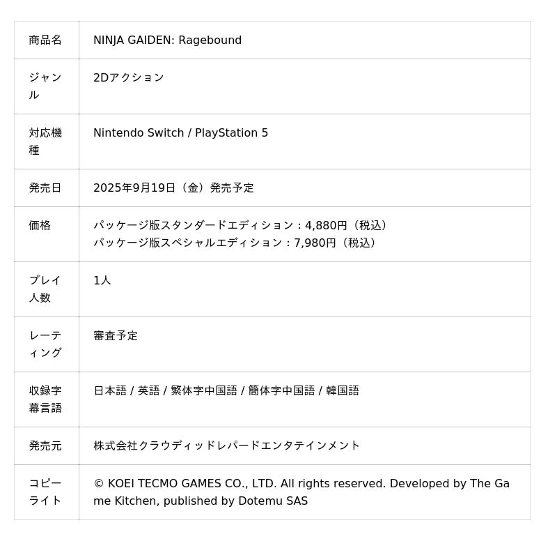 株式会社クラウディッドレパードエンタテインメント(代表取締役社長:陳 云云)は、2Dアクションゲーム『NINJA GAIDEN: Ragebound』(対応機種:Nintendo Switch™/PlayStation®5)のスタンダードエディションとスペシャルエディション(パッケージ版 *1)を、日本を含めたアジア地域に向けて、2025年9月19日(金)に発売します。