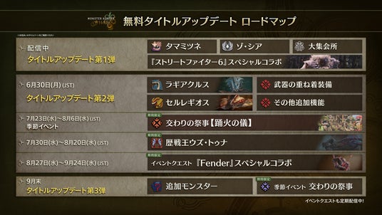 7月には季節イベントや歴戦王モンスター、8月にはFender®とのコラボイベントが開催予定。PS5およびXbox Series X|Sでは2時間の無料体験版も提供され、初めてのプレイヤーも気軽に参加できる。9月末には第3弾アップデートの配信も予定されている。