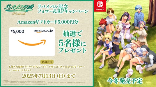 『悠久幻想曲リバイバル』の発売を記念して、悠久幻想曲リバイバル公式Xアカウント(@TAITO_yuukyuu)にて、Amazonギフトカードが当たるキャンペーンを実施します。詳しくは公式Xをご確認下さい。応募方法: