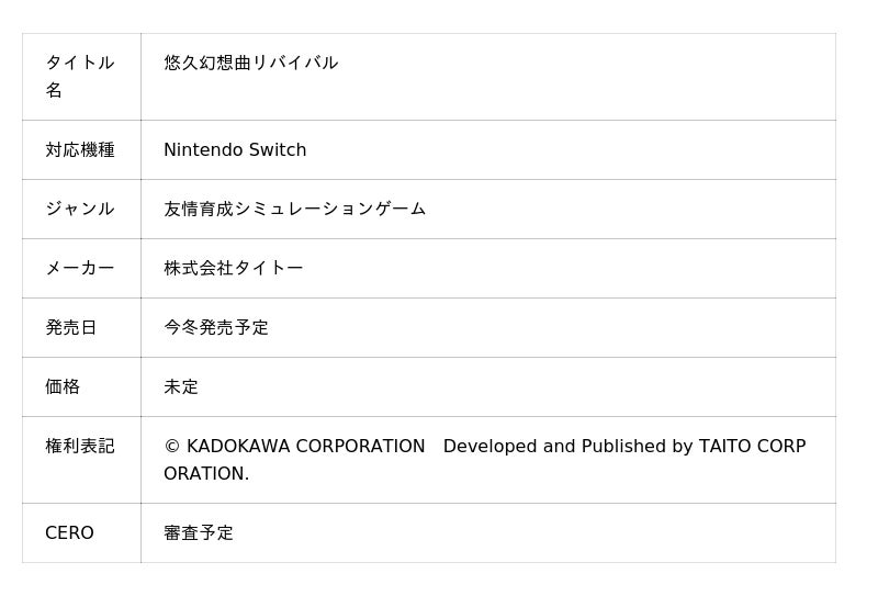 株式会社タイトー(本社:東京都新宿区、以下タイトー)は、友情育成シミュレーションゲーム『悠久幻想曲』のグラフィックを大幅にリニューアルし、初のリメイク作品となる、Nintendo Switch™用ソフト『悠久幻想曲リバイバル』を、この冬に発売することをお知らせいたします。公式サイトや公式Xも6月30日に公開し、発売を記念したXでのキャンペーンをあわせて実施いたします。