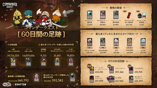 KRAFTON JAPAN株式会社は、ストラテジーゲーム『Commander Quest』の正式リリースから60日間のユーザープレイ統計を発表し、同作に新たな司令官「チンギス・カン」を追加するアップデートを実施。プレイ統計によれば、最も多く召喚されたユニットは「下級民兵隊」で総出撃回数は1,971万回に達する。最もプレイヤーを倒した敵司令官は「こもってるシャー」であり、最終戦「終わりなき神」への挑戦回数は累計16万回を超えた。