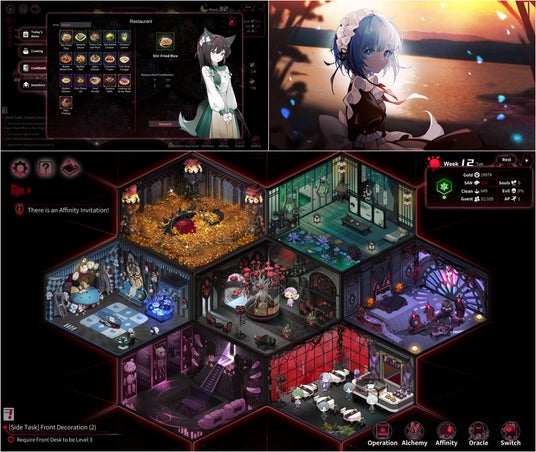 本作は死神、ドラゴン娘、スピリットハンター、バイオロイドのメイドなど、個性豊かな美少女キャラクターたちが従業員として登場し、プレイヤーと一緒にホテルを経営していくシミュレーションADVです。それぞれのキャラクターは独自の物語を持っているため、ゲームを進める中で各キャラクターの背景を知ることも楽しみの一つとして話題を呼んでいます。個性豊かなキャラクターとの交流や恋愛要素もあり、プレイヤーの選択で20種類以上のエンディングを迎えることができます。また、ホテル管理に加え、資源収集や料理、錬金術などの要素、神託システムを活用したSAN値(正気値)の管理も攻略する上で重要なポイントとなっています。
