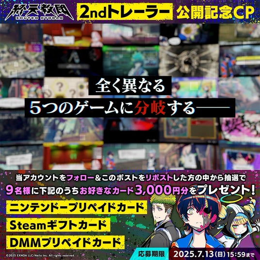 2ndトレーラー公開を記念し、『終天教団』公式Xにて「ニンテンドープリペイドカード」「Steamギフトカード」「DMMプリペイドカード」の中からお好きなプリペイドカード3,000円分を抽選で9名様にプレゼントするリポストキャンペーンを開催中です。是非キャンペーンへご参加ください。