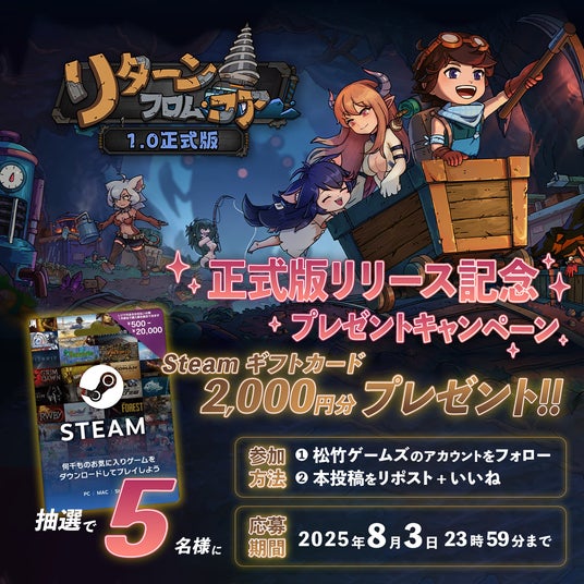 リリースを記念し、8月1日午前10時59分までの期間限定で、通常価格1,900円のところを30%オフの1,330円で購入できるローンチセールを実施中。さらに、松竹ゲームズ公式X(旧Twitter)では、抽選で5名に2,000円分のSteamギフトカードが当たるプレゼントキャンペーンも開催されている。