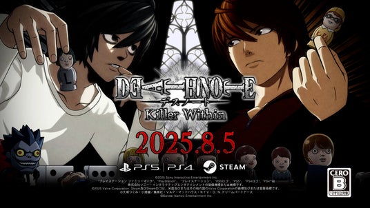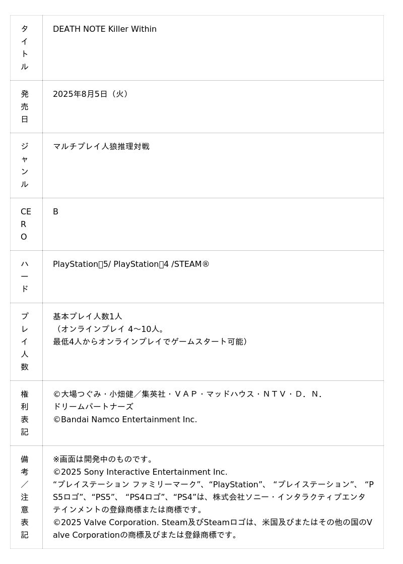 株式会社バンダイナムコエンターテインメントは、2025年8月5日にPlayStation®5、PlayStation®4、STEAM®向けの新作ゲーム「DEATH NOTE Killer Within」を発売する。最大10人で対戦できるマルチプレイ人狼推理ゲームで、キラ陣営とL陣営に分かれ、役職の特性を駆使しながら疑念と裏切りが交錯する心理戦が展開される。クロスプレイに対応し、アバターやネームプレートなどの外見変更も可能だ。