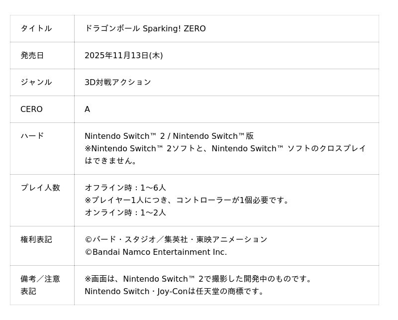株式会社バンダイナムコエンターテインメントは、2025年11月13日にNintendo Switch™ 2およびNintendo Switch™向けに「ドラゴンボール Sparking! ZERO」を発売すると発表した。本作は、Joy-Con™ 2やJoy-Con™のモーションコントロールで「かめはめ波」や「ギャリック砲」などの必殺技を繰り出すことができる。特装版には、限定ジオラマやフィギュア、マルチアクリルスタンドなどの豪華特典が付属する。