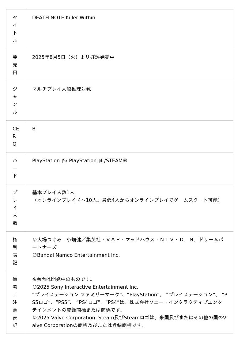 株式会社バンダイナムコエンターテインメントは、2025年8月5日にPlayStation®およびSTEAM®向けソフト『DEATH NOTE Killer Within』を発売した。最大10人で楽しめるマルチプレイの人狼推理対戦ゲームで、プレイヤーはキラ陣営とL陣営に分かれ、行動フェイズと会議フェイズを繰り返しながら、互いの正体を暴くことを目指す。