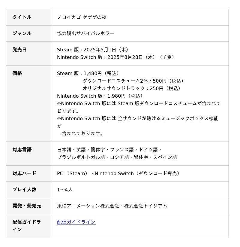 東映アニメーションとトイジアムは、新作ホラーゲーム『ノロイカゴ ゲゲゲの夜』のNintendo Switch版を発表し、追加要素やコロコロ魂フェスティバルへの出展を告知した。
