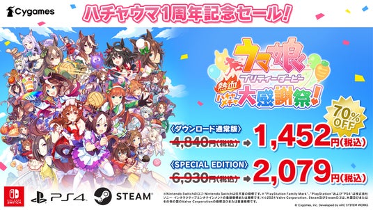 株式会社Cygamesは、Nintendo Switch™、PlayStation®4、Steam®向けのドット絵アクションゲーム『ウマ娘 プリティーダービー 熱血ハチャメチャ大感謝祭!』が2025年8月30日に発売1周年を迎え、これを記念して特別イラストの公開とともに70%OFFの大幅値引きセールを実施している。