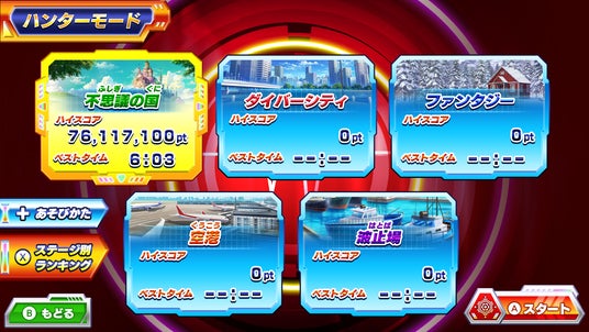 「ハンターモード」ではクリア時間の速さによってきまるスコアで順位を決定。