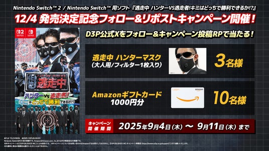 株式会社ディースリー・パブリッシャーは、人気シリーズ「逃走中」の最新作『逃走中 ハンターVS逃走者! キミはどっちで勝利できるか!?』を2025年12月4日にNintendo Switch™2およびNintendo Switch向けに発売すると発表した。本作は、逃走者としてハンターから逃げる基本ルールを踏襲しつつ、シリーズ初となる「ハンターモード」や、最大12人が参加可能なオンライン対戦機能を新たに搭載している。