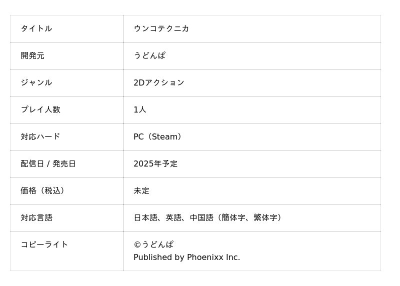株式会社Phoenixx(フィーニックス)(東京都武蔵野市、代表取締役社長:坂本 和則)は、うどんぱ氏開発の2Dアクションゲーム『ウンコテクニカ』のパブリッシャーがPhoenixxに決定したことをお知らせいたします。