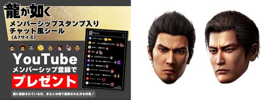 「龍が如くスタジオ 公式YouTubeチャンネル」のメンバーシップ画面を、該当スタッフに提示いただくと「龍が如く メンバーシップスタンプ入りチャット風シール(A7サイズ)」をプレゼントいたします。