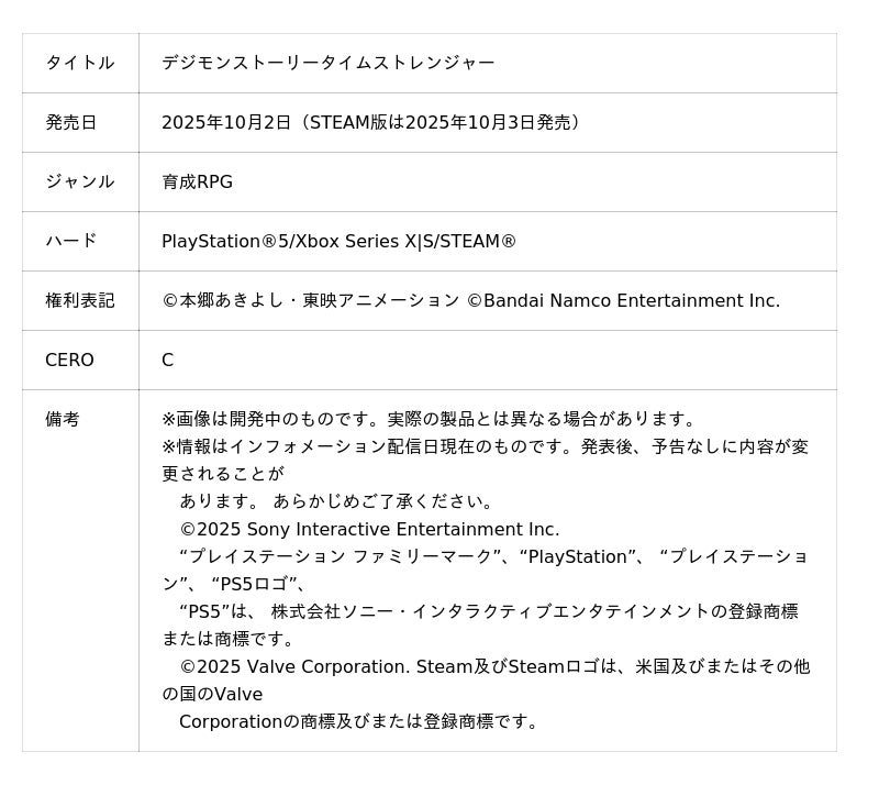 株式会社バンダイナムコエンターテインメントは、育成RPG「デジモンストーリー」シリーズ最新作『デジモンストーリー タイムストレンジャー』を、2025年10月2日にPlayStation®5およびXbox Series X|S向けに発売し、3日にはSTEAM®版も発売した。追加エピソードやデジモンを収録したシーズンパス、デラックスエディションなどのダウンロード版コンテンツも販売中だ。