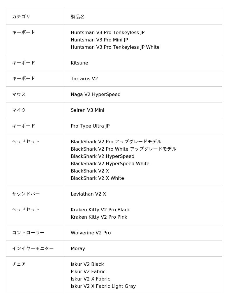 注目製品には、精密なアクチュエーション調整が可能な「Razer Huntsman V3 Pro Tenkeyless JP」や、コンパクトで持ち運びに便利な60%サイズの「Razer Huntsman V3 Pro Mini」、レバーレス設計の格闘ゲーム向けアーケードコントローラー「Razer Kitsune」、軽量かつ高遮音性の「Razer BlackShark V2 X」ヘッドセット、コンパクトで高音質なUSBマイク「Razer Seiren V3 Mini」、特別カラーの猫耳ヘッドセット「Razer Kraken Kitty V2 Pro Black & Pink」など、多彩なラインナップを展開している。