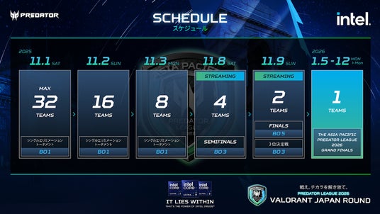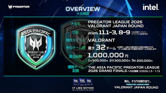 日本エイサー株式会社(本社:東京都新宿区、代表取締役社長:ボブ・セン)は、2026年1月5日から1月12日(渡航予定日・帰国予定日含む)にインド・ニューデリーで開催するAcer Asia Pacific主催のeスポーツ大会「The Asia Pacific Predator League 2026 Grand Finals(アジア・パシフィック プレデターリーグ 2026 グランドファイナルズ、以下Predator League 2026)」に向けた、日本公式予選、「Predator League 2026 VALORANT Japan Round」の開催決定、ならびに同予選への出場チームの募集を開始しましたことをお知らせいたします。