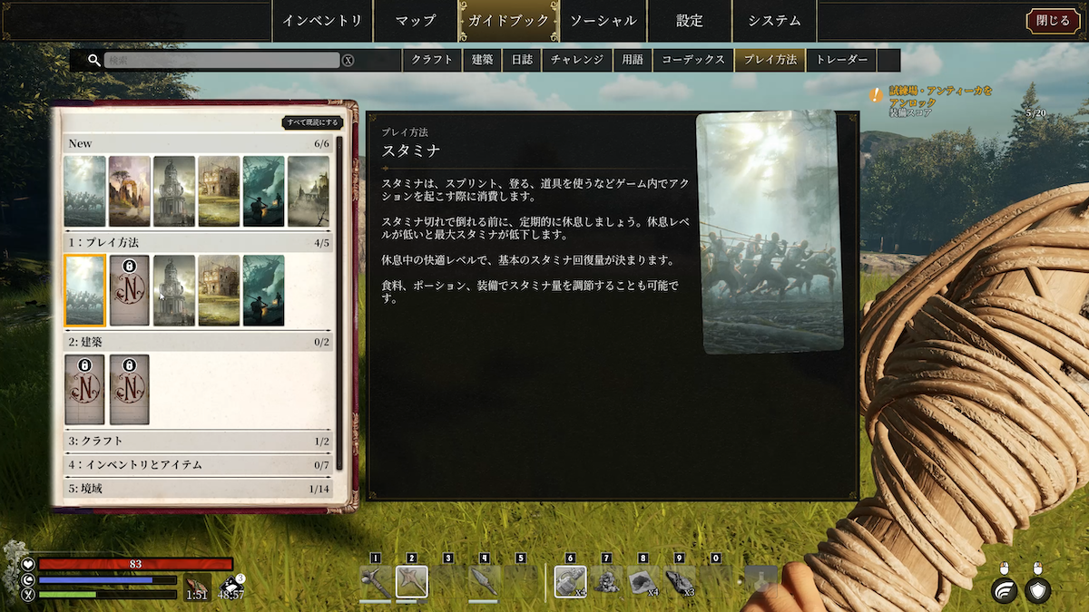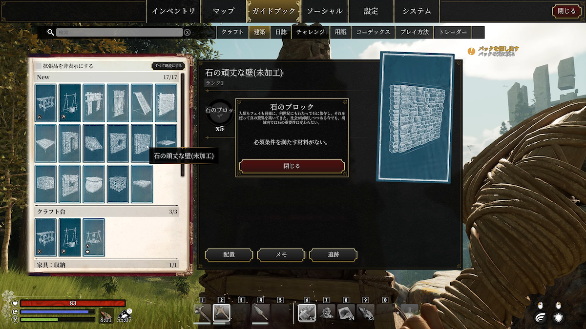 3つ目の土地は「沼地」。ここまで来るとクラフトできるものもかなり増えてくる。メニュー内にある「ガイドブック」からクラフトできるが、木製の建造物から石造りの建造物へと作れるレベルが上がっている。これらは新しいレシピを見つけることでどんどん高度なものが作れるようになっていく。