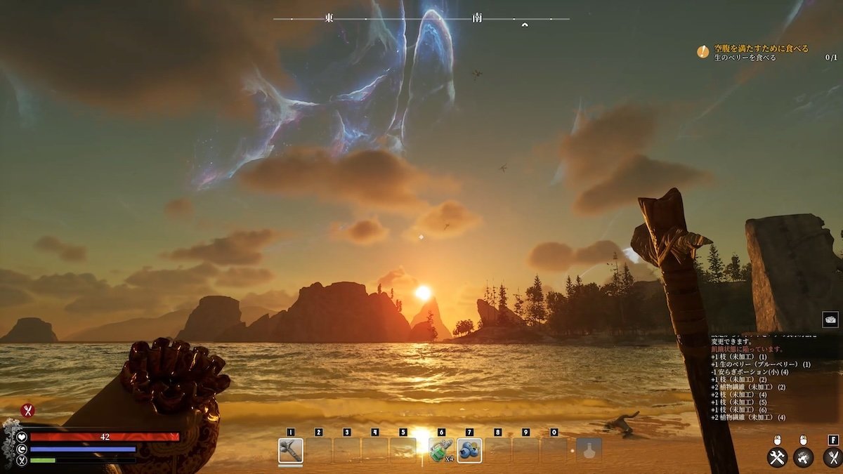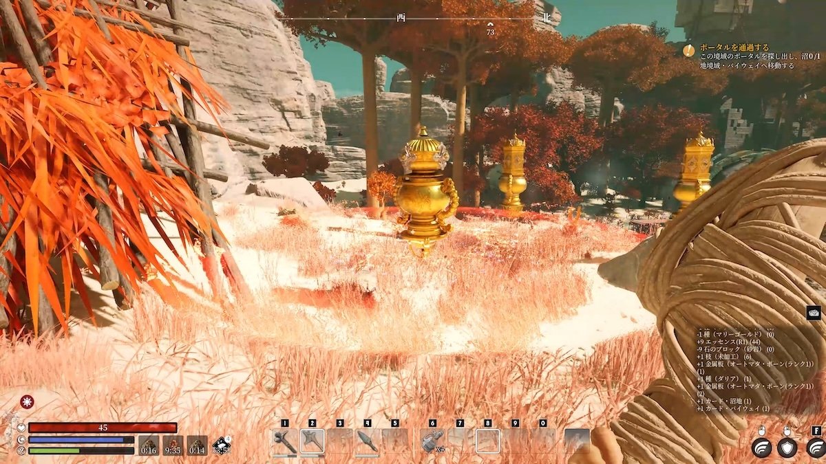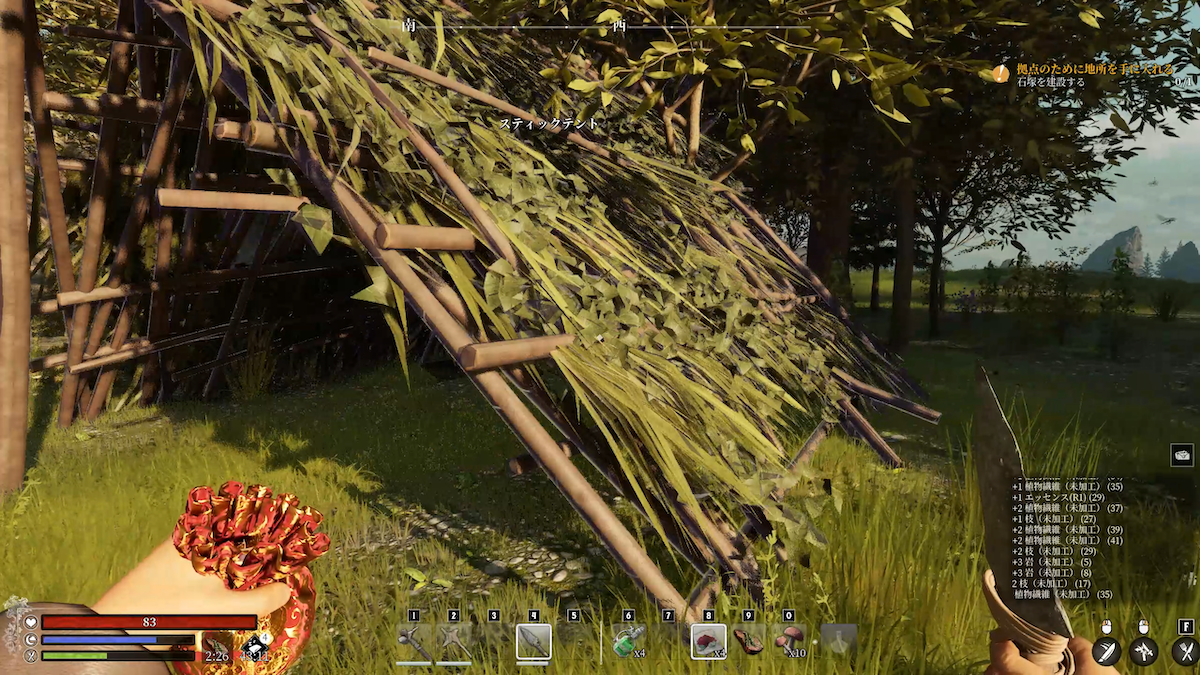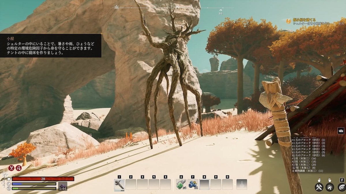 「森林」では、周囲にある草木や木の実などを採集して、寝床やテントなどを建築していく。パックの指示通りにある程度のクラフトができると、次のポータルに移動して……というところまでがチュートリアルだ。