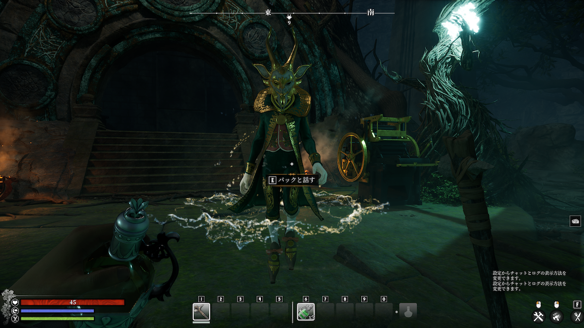 周囲を見渡すと「パック」という仮面を被って空に浮いている存在が現れる。彼はこれから先、さまざまな場面でプレイヤーを導いてくれる。