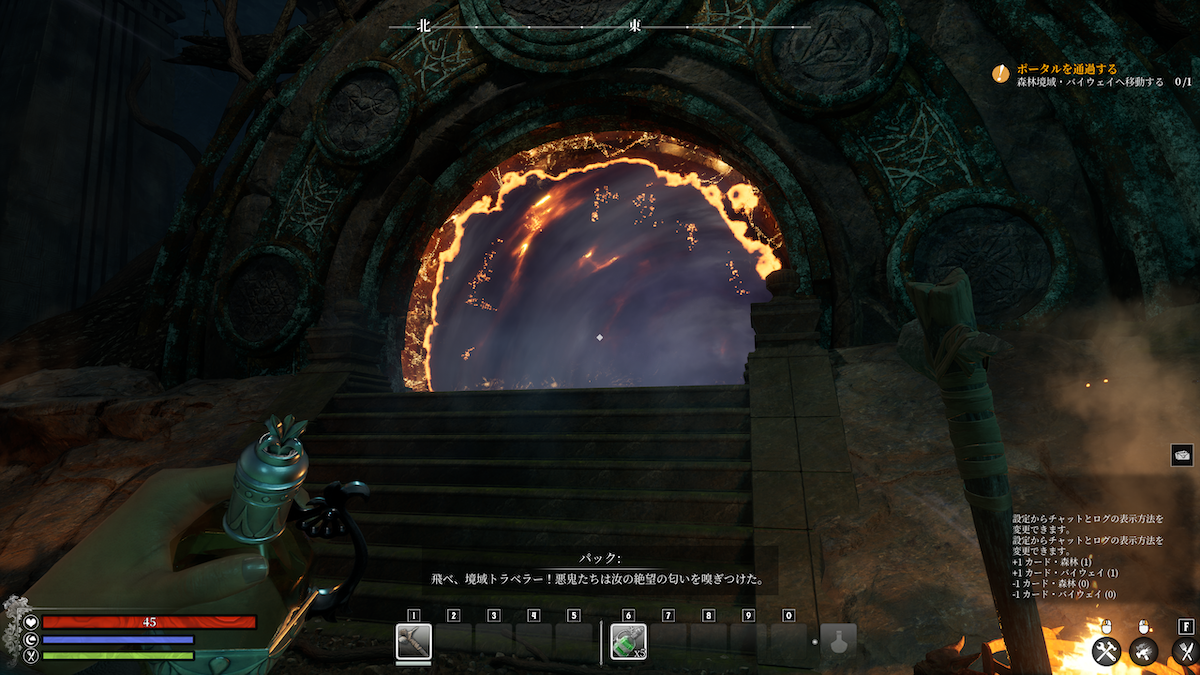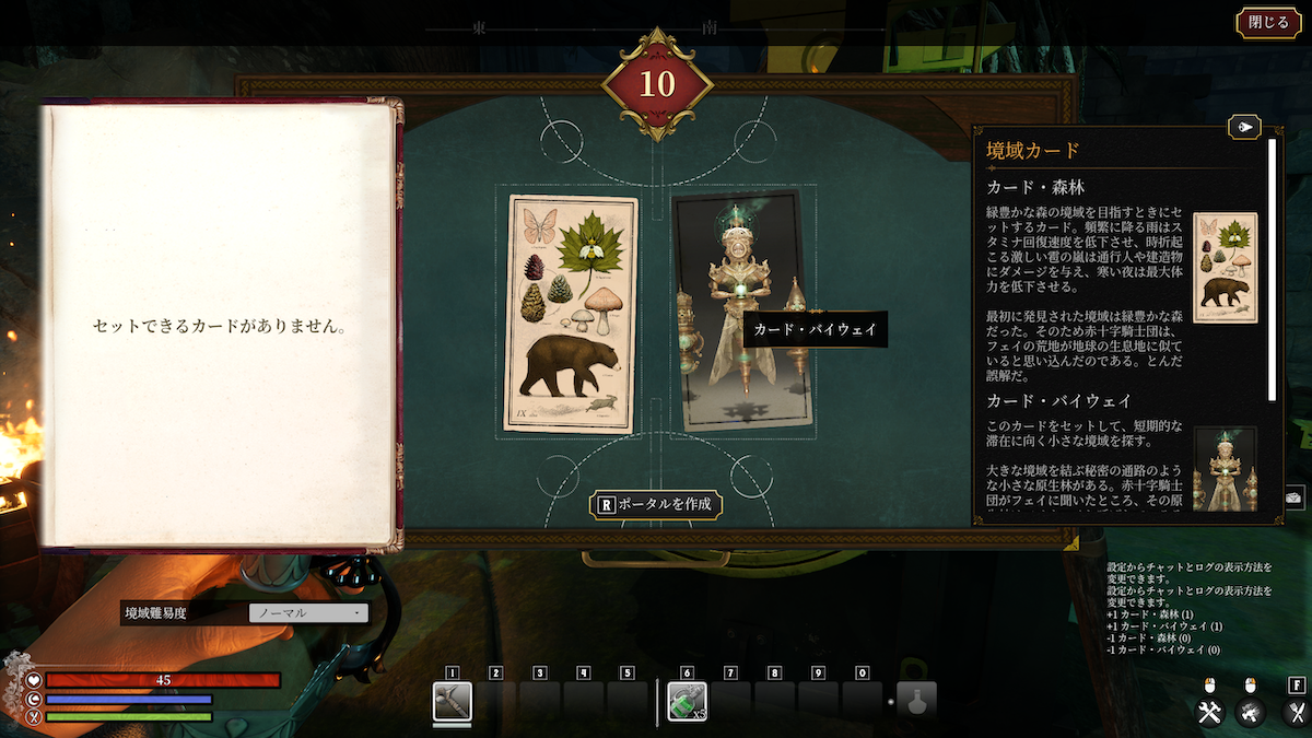 活版印刷のような機械に近づくと、カードをセットできる。このカードによってさまざまな「境域」に移動でき、その場所の環境を変更できるようになっていくのだが、それはまだまだ先の話だ。まずは「森林」のカードをセットするとポータルを作成し、ゲートが開く。