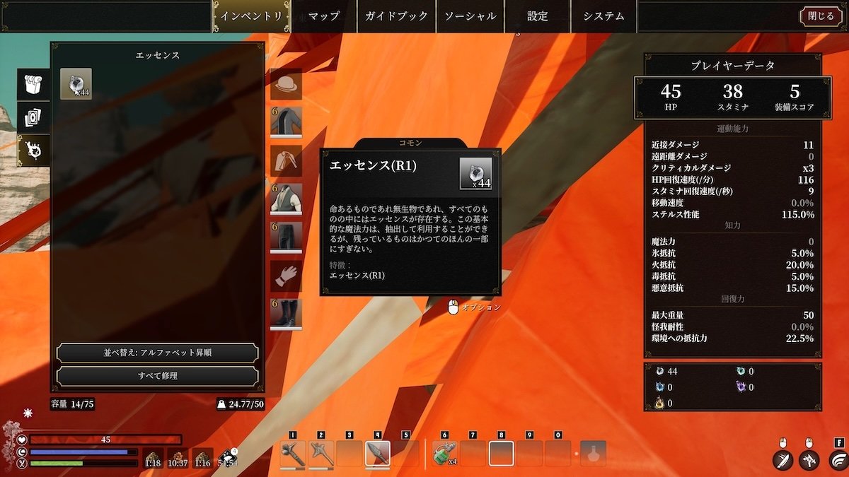 また、さまざまな素材には「エッセンス」と呼ばれるものが宿っており、素材から「抽出」を選ぶと獲得できる。これらは魔法を使うためのエネルギーとして、のちのち使うことになる。
