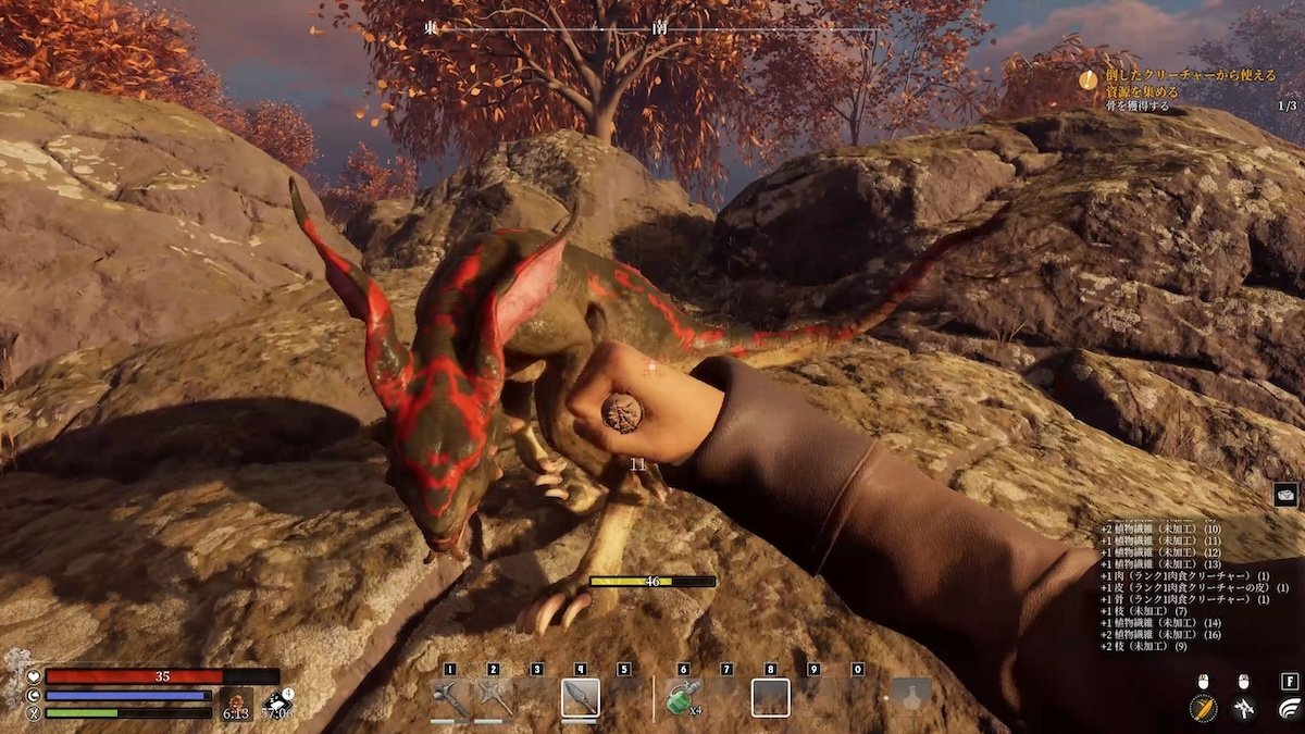バトル部分では、ナイフなどの武器をクラフトして戦うことが可能。生き物を倒すと肉や皮や骨などが手に入り、食料や新たなアイテムの素材として活用できる。