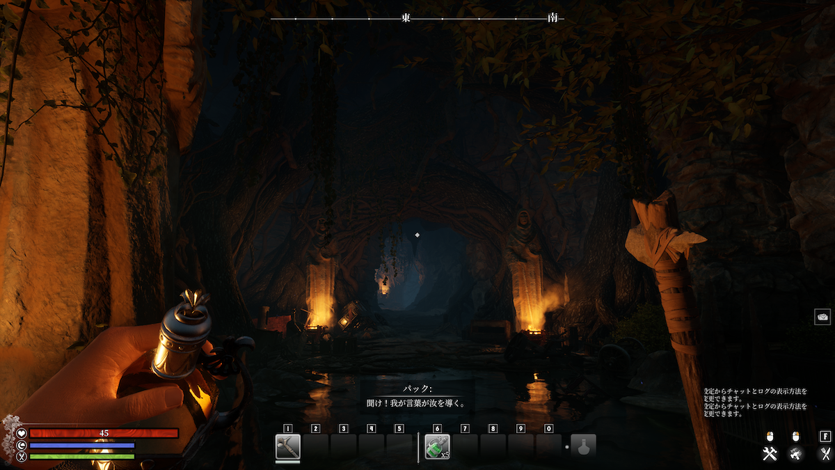 見知らぬ洞窟のような場所に降り立ったプレイヤーは、右手には武器らしきもの、左手には薬らしきものを持ち、体力や体調を示すバーなども見える。