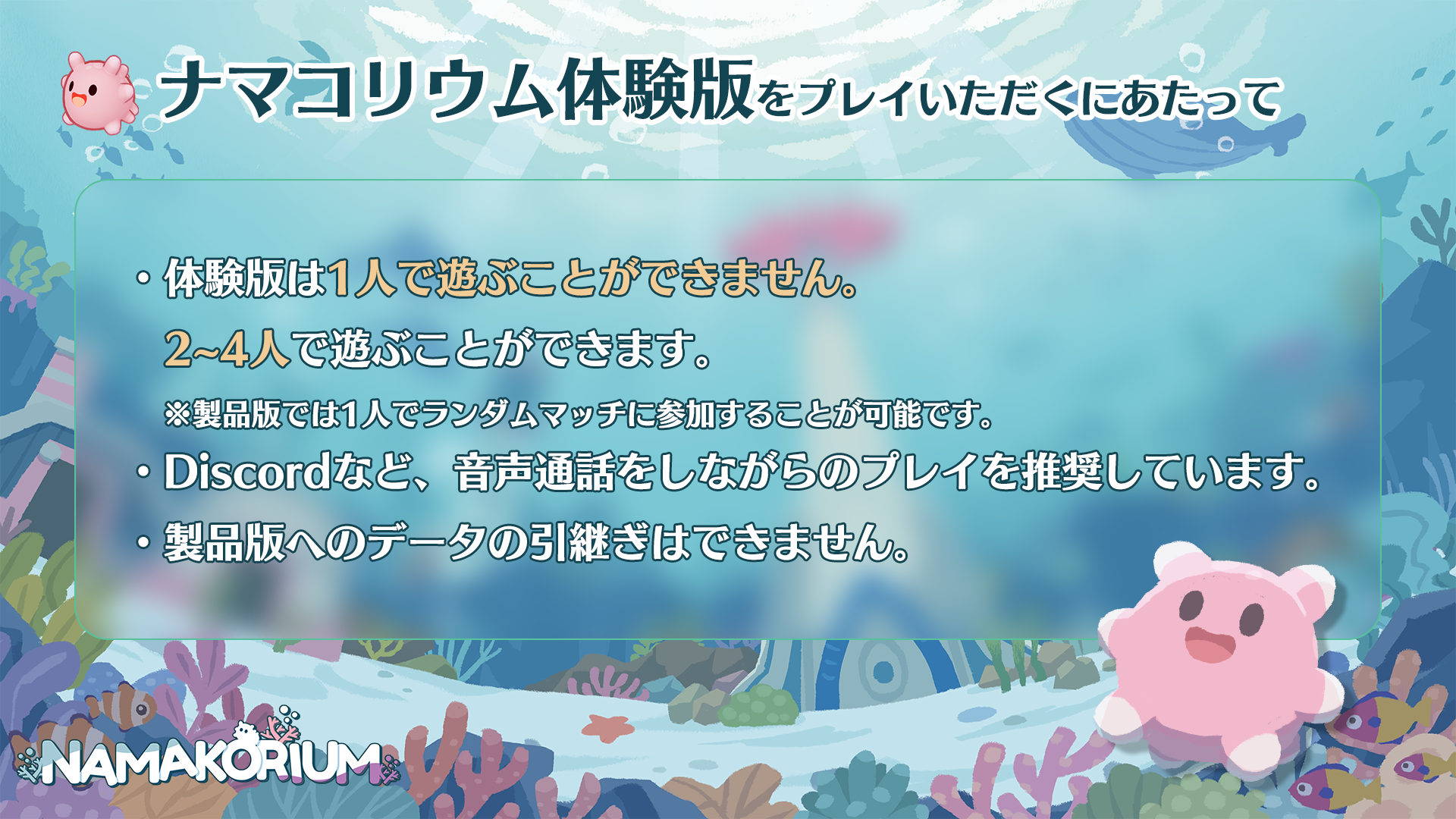 NAMAKORIUM(ナマコリウム)体験版では、2つのステージを最大4人のマルチプレイで遊ぶことができます。体験版では1人で遊ぶことができず、参加コードを共有できる2人以上のプレイヤーが必要となります。また、NAMAKORIUM体験版を扱った配信・動画投稿は大歓迎、配信禁止区間はなく、収益化も問題ありません。配信時は、概要欄にSteamストアページのリンクを記載ください。
