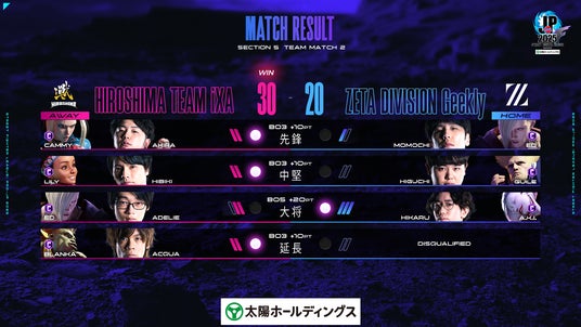 延長戦は「ZETA DIVISION Geekly」の「翔選手」が欠場のため、「広島 TEAM iXA」の不戦勝となり、30-20で「広島 TEAM iXA」が勝利。ランキング首位で後半節に挑む。