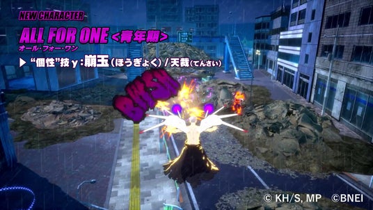 「僕のヒーローアカデミア ULTRA RUMBLE」に新プレイアブルキャラクターとして「オール・フォー・ワン<青年期>」が参戦!様々な”個性”を組み合わせ、攻撃範囲が変化する”個性”技に加え、相手の特殊アクションを封じることも可能だ!状況に応じて使い分け、戦場を制圧せよ!