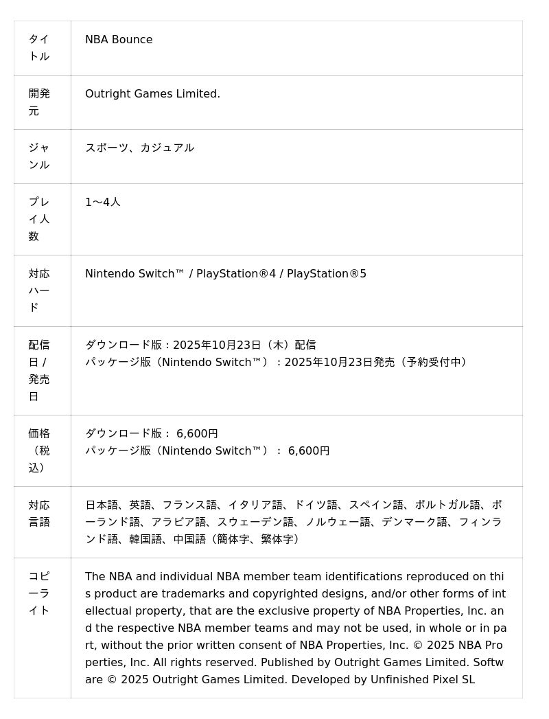 株式会社Phoenixx(フィーニックス)(東京都武蔵野市、代表取締役社長:坂本 和則)は、スポーツゲーム『NBA Bounce』について、2025年10月23日(木)よりNintendo Switch™ / PlayStation®️4 / PlayStation®️5向けに、販売開始することをお知らせいたします。