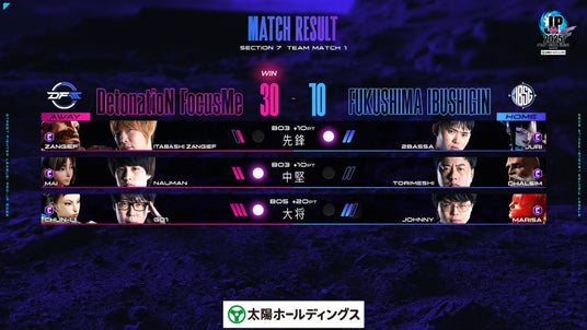 株式会社カプコンは、「ストリートファイターリーグ: Pro-JP 2025 Division F 第7節」(11月4日開催)の結果を発表した。DetonatioN FocusMe対FUKUSHIMA IBUSHIGINは、GO1選手が春麗でジョニィ選手のマリーザに逆転勝利し、DetonatioN FocusMeが勝利した。精密な立ち回りが光る内容で、GO1選手は今季2勝目を挙げた。広島 TEAM iXA対REJECTの一戦では、ふ~ど選手のエドが圧倒的な強さを見せ、大将戦で勝利。REJECTは40ポイントを獲得し、首位を奪還した。ZETA DIVISION Geekly対VARRELの試合では、ももち選手がマゴ選手との頂上対決を制した。フルセット・フルラウンドの末、ドライブインパクトを返して劇的な逆転勝利を飾った。