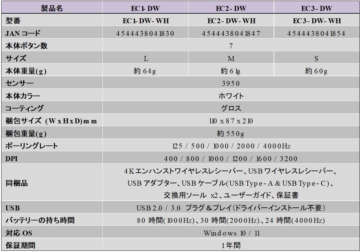 「EC1-DW」「EC2-DW」「EC3-DW」製品仕様表