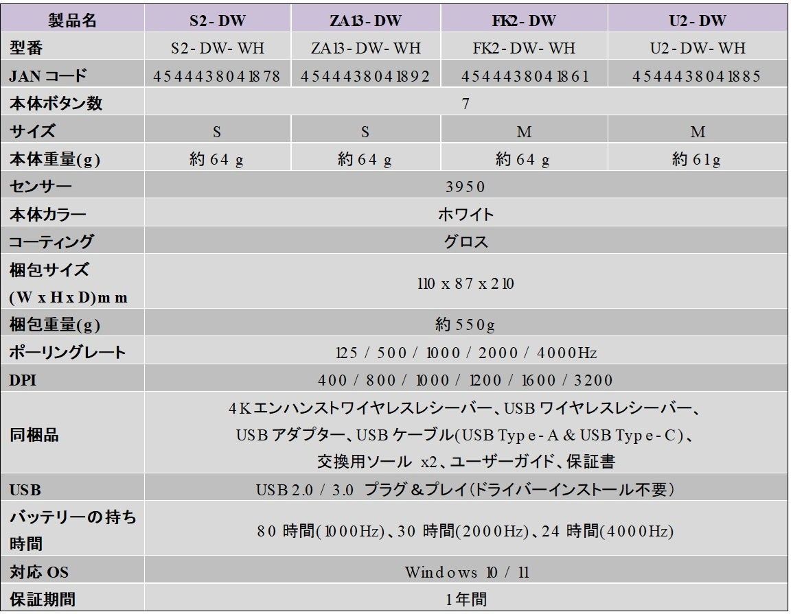 「S2-DW」「ZA13-DW」「FK2-DW」「U2-DW」製品仕様表