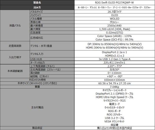 半透明シルバー筐体とタンデムOLED採用の27型ゲーミングモニター「ROG Swift OLED PG27AQWP-W」11/29発売