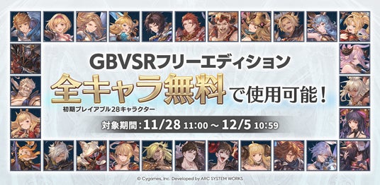 現在、無料で遊べる『GBVSRフリーエディション』では、期間限定で初期プレイアブルキャラクターの全28人を使用可能です。この機会に、ぜひお楽しみください。