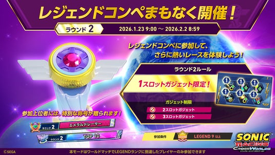 トップレーサー向けの期間限定イベント「レジェンドコンペ」のラウンド2を1月23日(金)から開催します。本イベントは、ワールドマッチのLEGEND9以上のプレイヤーだけが参加できるオンラインイベントです。参加者には達成報酬として限定称号が付与されますので、ぜひご参加ください。開催期間:2026年1月23日(金)9:00(JST)~2月2日(月)8:59(JST)