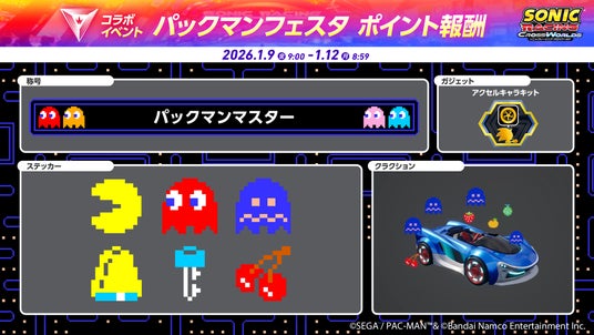 株式会社セガは、発売中の『ソニックレーシング クロスワールド』について、2026年1月8日(木)より有償ダウンロードコンテンツ(DLC)第3弾『パックマン パック』の配信を開始したことをお知らせいたします。
