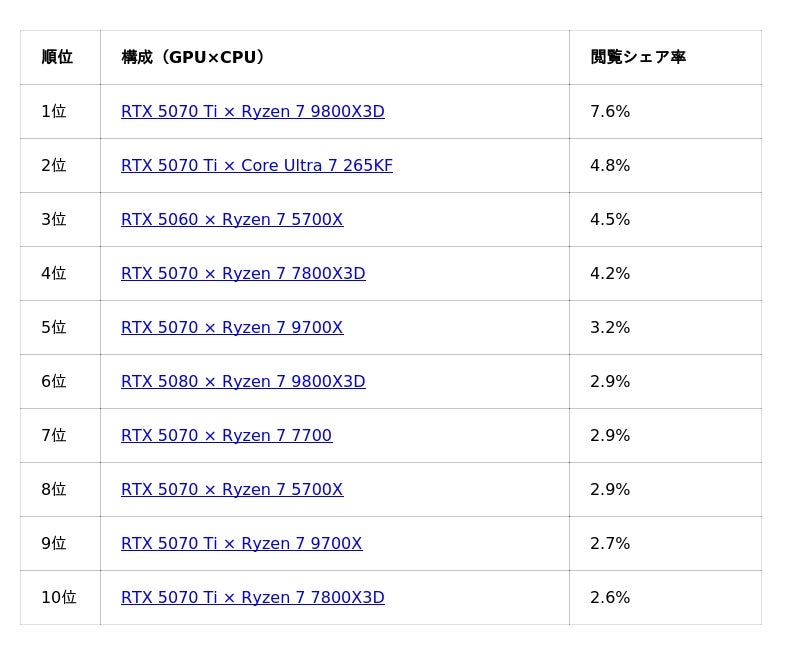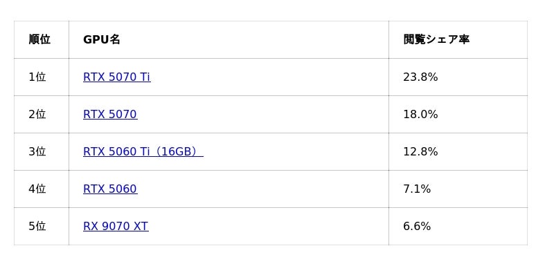 続いて上位には、RTX 5070、RTX 5060 TiといったGPUが続いており、ミドル~ハイエンド帯のGPUに関心が寄せられている形が見られます。