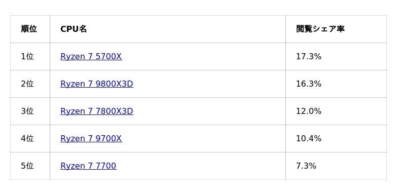 1位から5位までRyzen 7シリーズがランクイン。今回表への掲載はありませんが、6位以降ではCore UltraシリーズやCore i7も一定の関心を集めています。