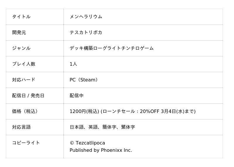 株式会社Phoenixx(フィーニックス)(東京都武蔵野市、代表取締役社長:坂本 和則)は、デッキ構築ローグライトチンチロゲーム『メンヘラリウム』をSteam(PC)向けに、本日 2月18日(水)17時より配信開始したことをお知らせいたします。